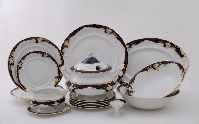 Обеденный сервиз на 12 персон "Кобальтовый орнамент" формы "Соната" от чешской марки Leander включает в себя :